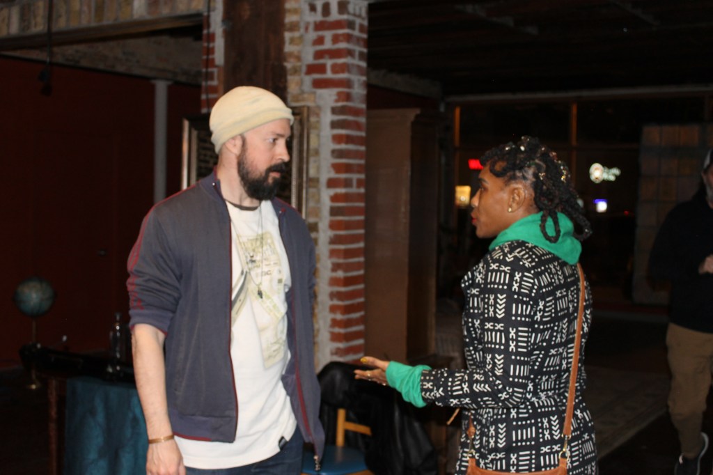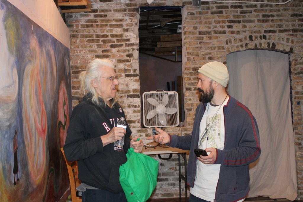 Lynn Fitzgerald enjoys a lively post performance conversation with poet/performer Oliver Khan, who is a lawyer by day and lives in Lombard with his family. (Photo by C. Schandelmeier)