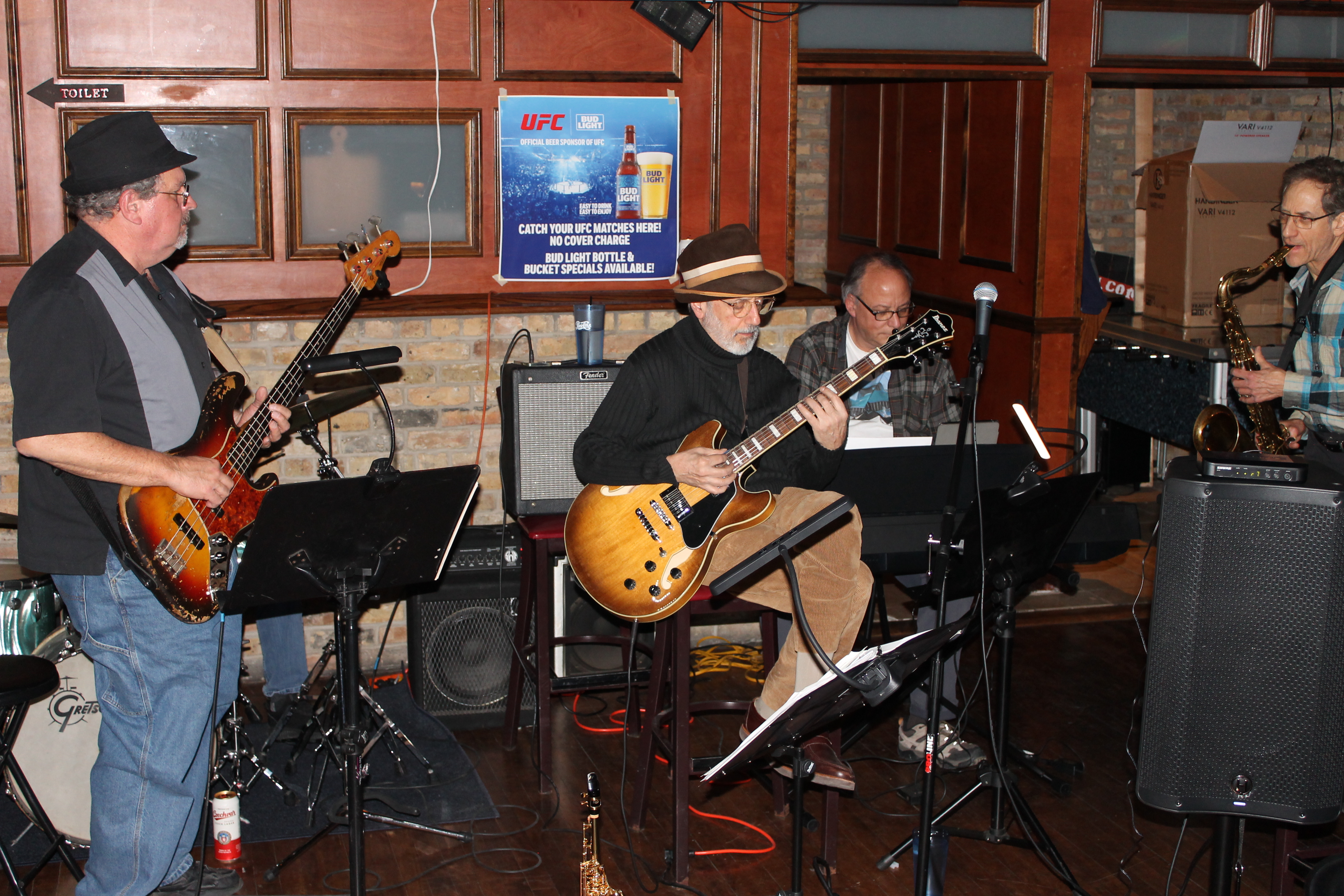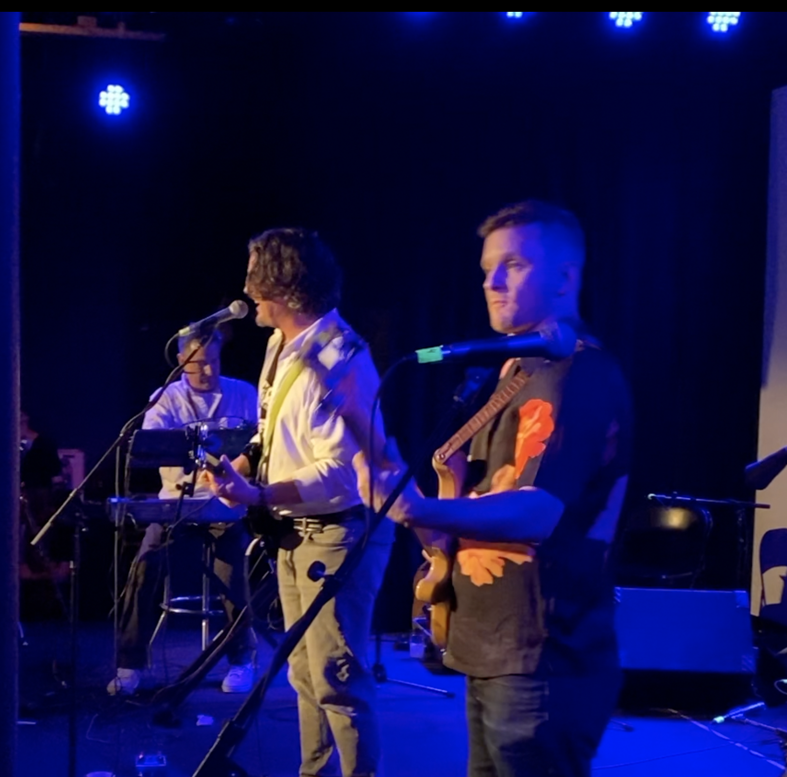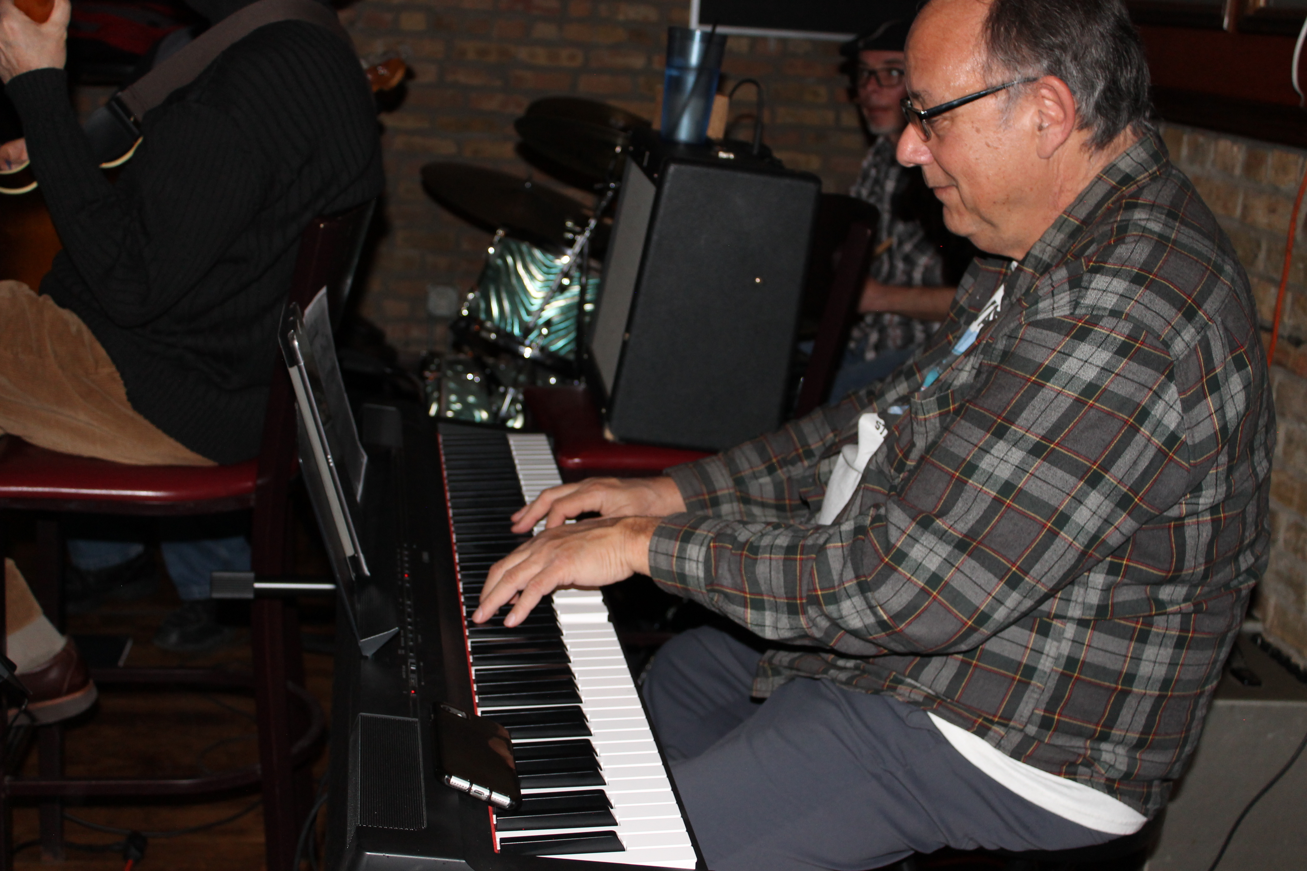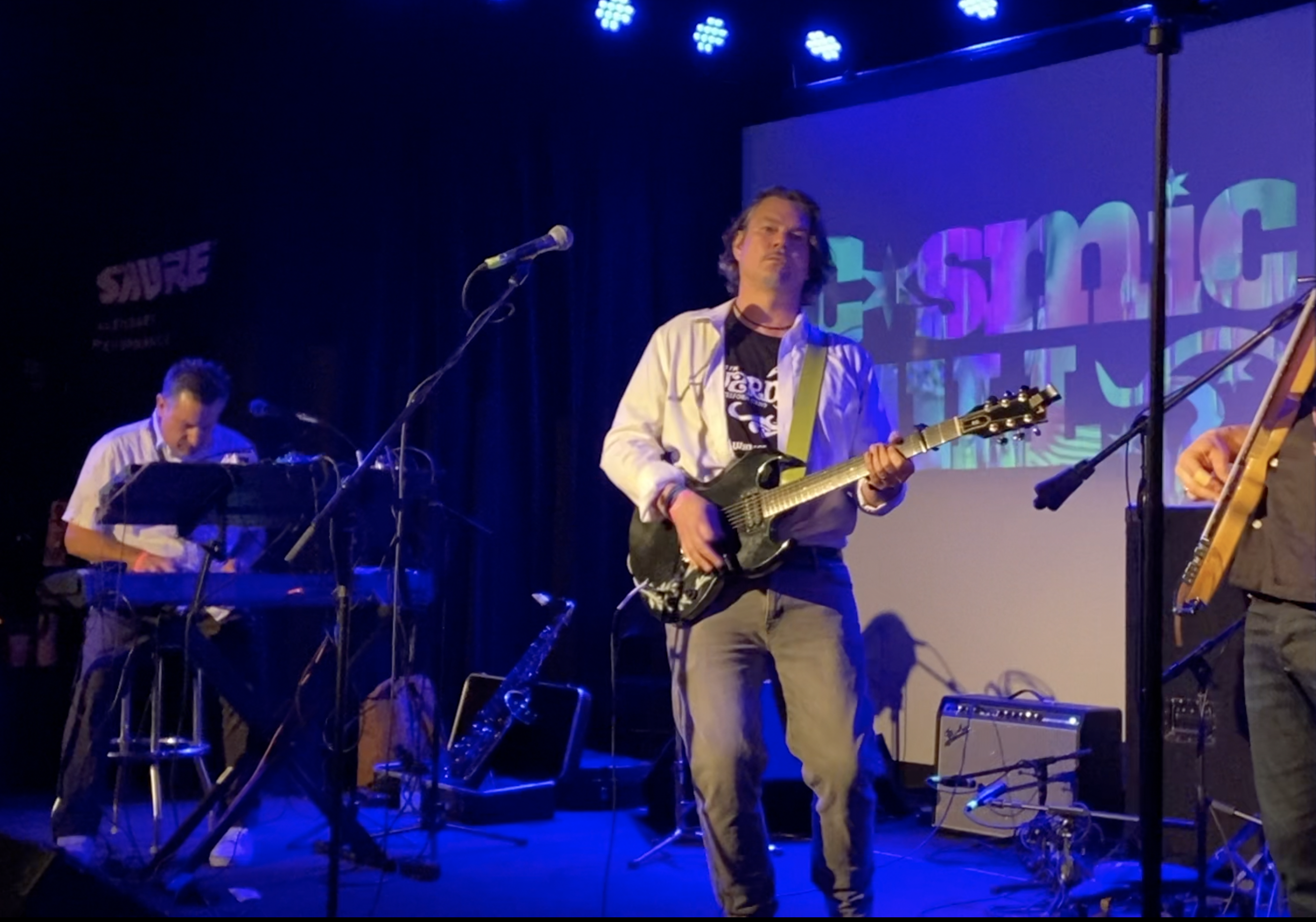 Jim Dinou on keyboard (also saxophone) Mark Vickery, singer/songwriter, and Patrick Dinnen on guitar. All are in the band Cosmic Bull.