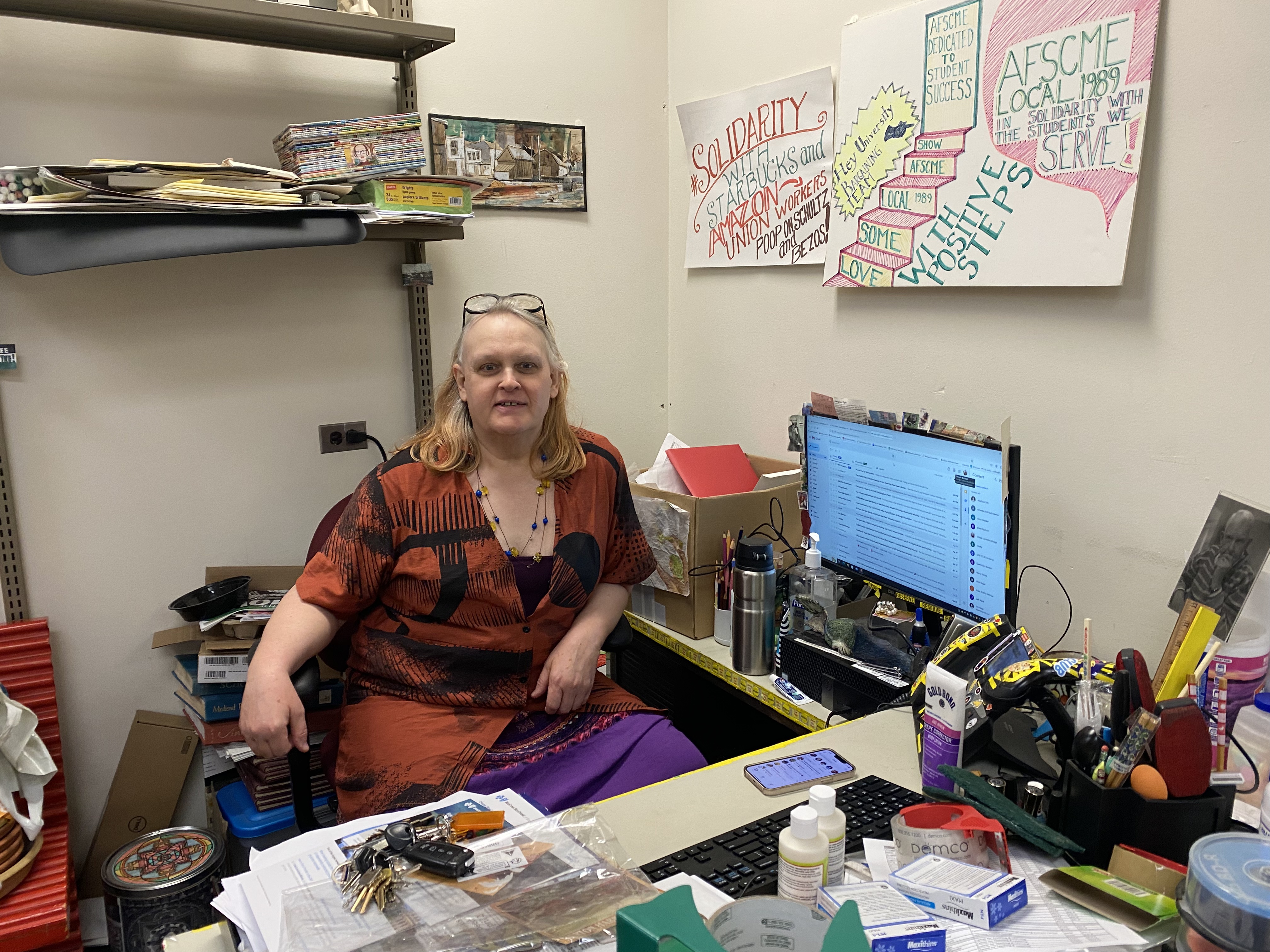 Alexis Judeah was excited to see the WZRD for Palestine poster up outside of the radio station on May 21, 2024. (Photo by C. Schandelmeier)