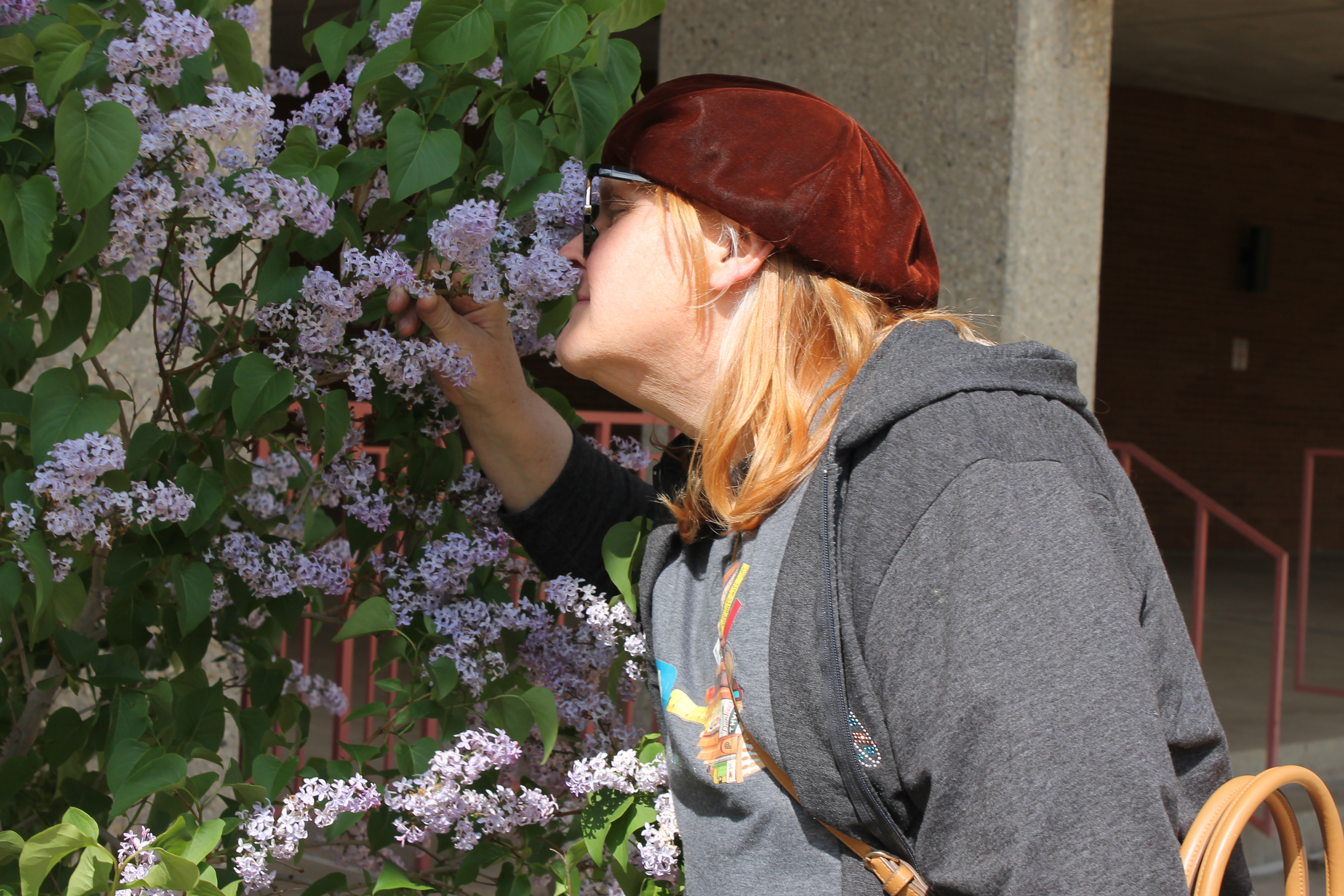 Alexis Judeh admires the Sharon Hahs Garden outside of the Ronald Williams Libarary on the campus of Northeastern Illinois University, where she had arrived for an interview with WZRD Chicago 88.3 FM. (Photo by C. Schandelmeier)
